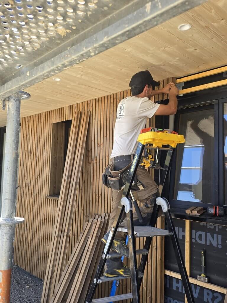 Nous avons réalisé la pose d’un bardage métallique effet joint debout sur la partie garage, apportant une finition contemporaine et durable. Le reste de l’habitation a été habillé d’un bardage bois, créant un contraste esthétique harmonieux avec le métal.