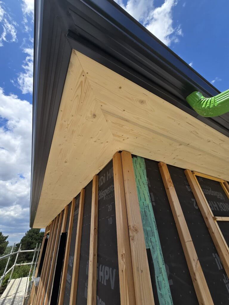 Nous avons également assuré la pose des sous-faces de débords de toiture en panneaux trois plis sapin/épicéa, garantissant des finitions soignées et une parfaite intégration de l’ensemble.